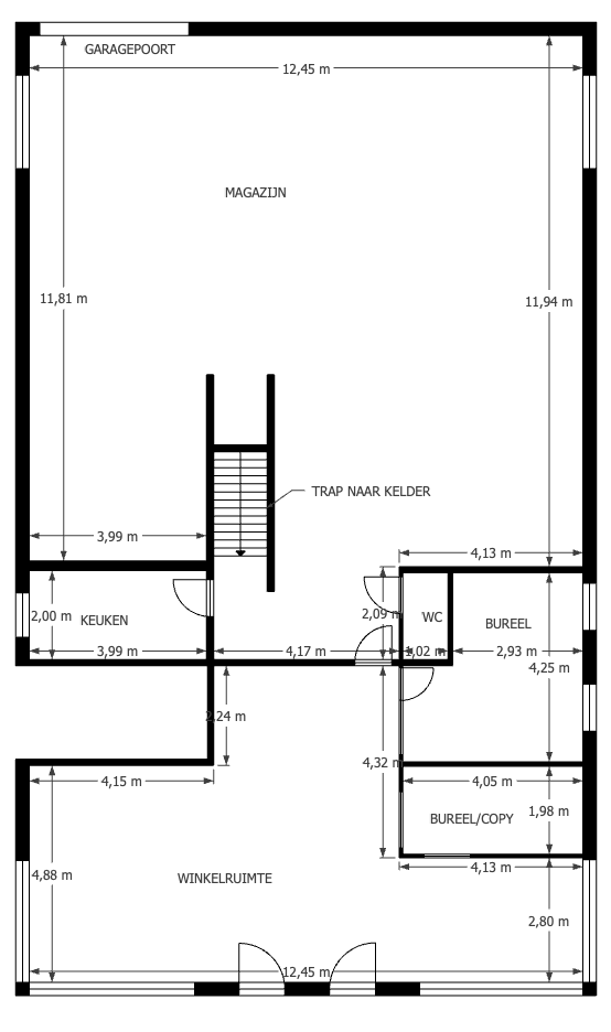 Achter de winkel is er een magazijn van 155 m2 met een sectionaalpoort aan de achterzijde. In de kelderverdieping is er nog een stockageruimte van 150m2!